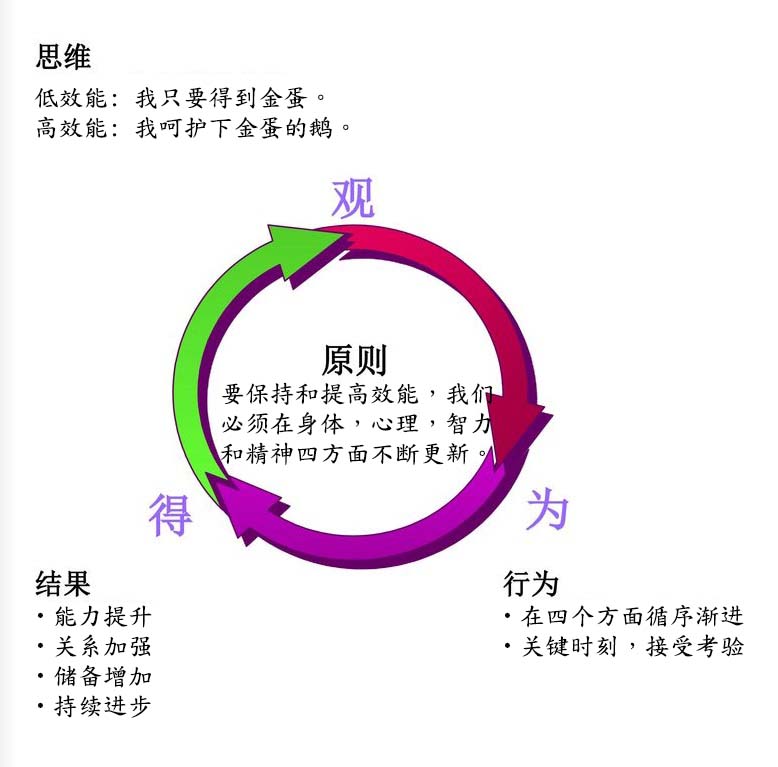 “不断更新”就是不断提升个人产能,保护并优化你所拥有的最重要的资源——你自己。从身体、精神、智力、社会/情感这四个方面更新你的天性,要以睿智而均衡的方式,经常并持续运用这四个层面。